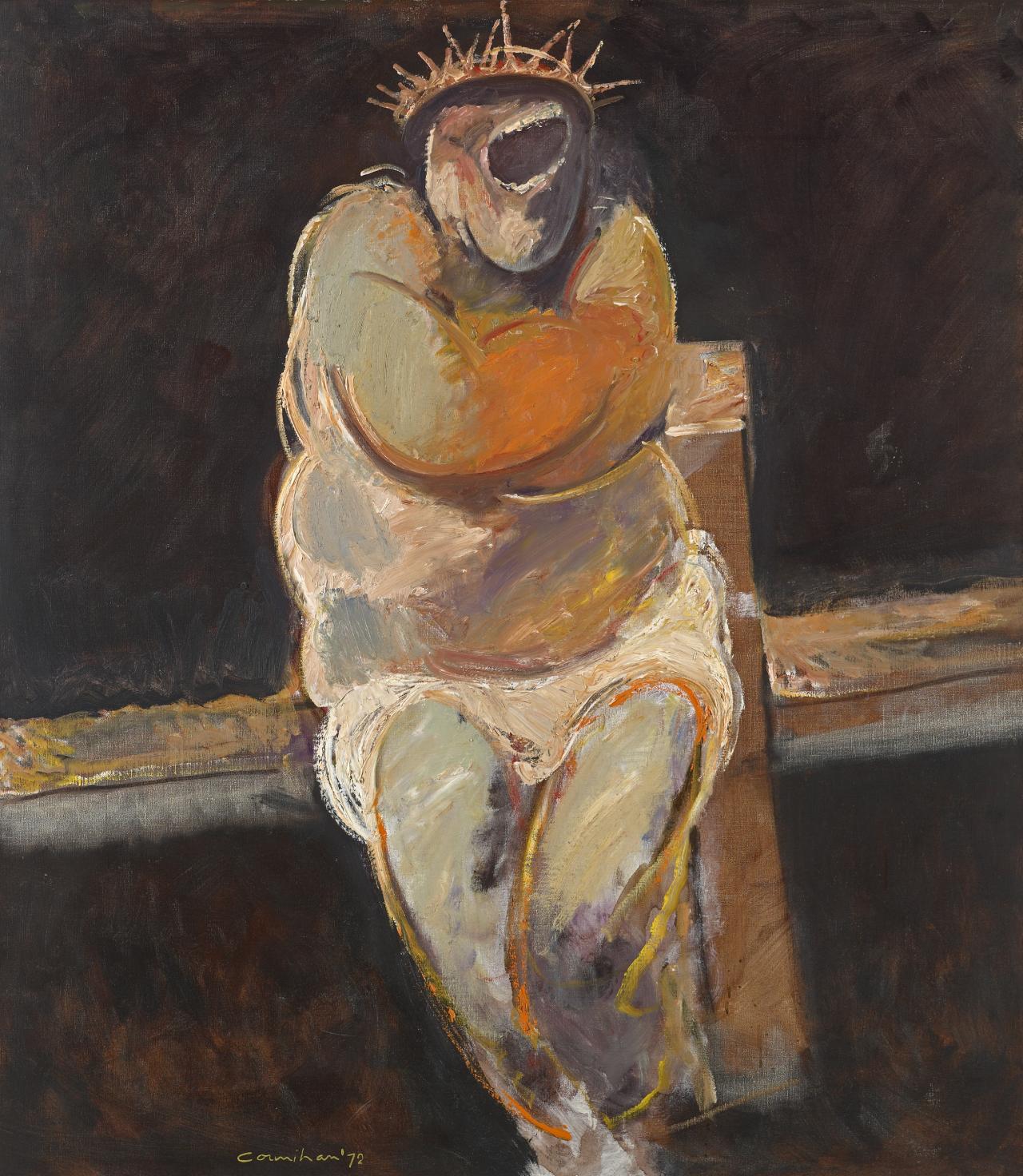 Counihan’s Christ is an Australian. He sits upon the cross, arms folded across his body like a wharfie at a union meeting. He wears his crown of thorns indifferently, even jauntily. The bulky figure exudes apathy and indifference, the mouth wide with cynicism and condemnation.