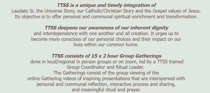 “We have found the TTSS journey a prayerful experience that engaged us in a process that has both deepened and strengthened our spirituality. It was wonderful! The graphics and imagery were mesmerizing.” (Fran) “It all makes so much sense… It touched me so deeply… I was drawn into and enjoyed every moment of the journey… I feel alive and am learning… Cosmic theology is making me think and think deeply… It was so profoundly and personally presented.” (Various Participants)